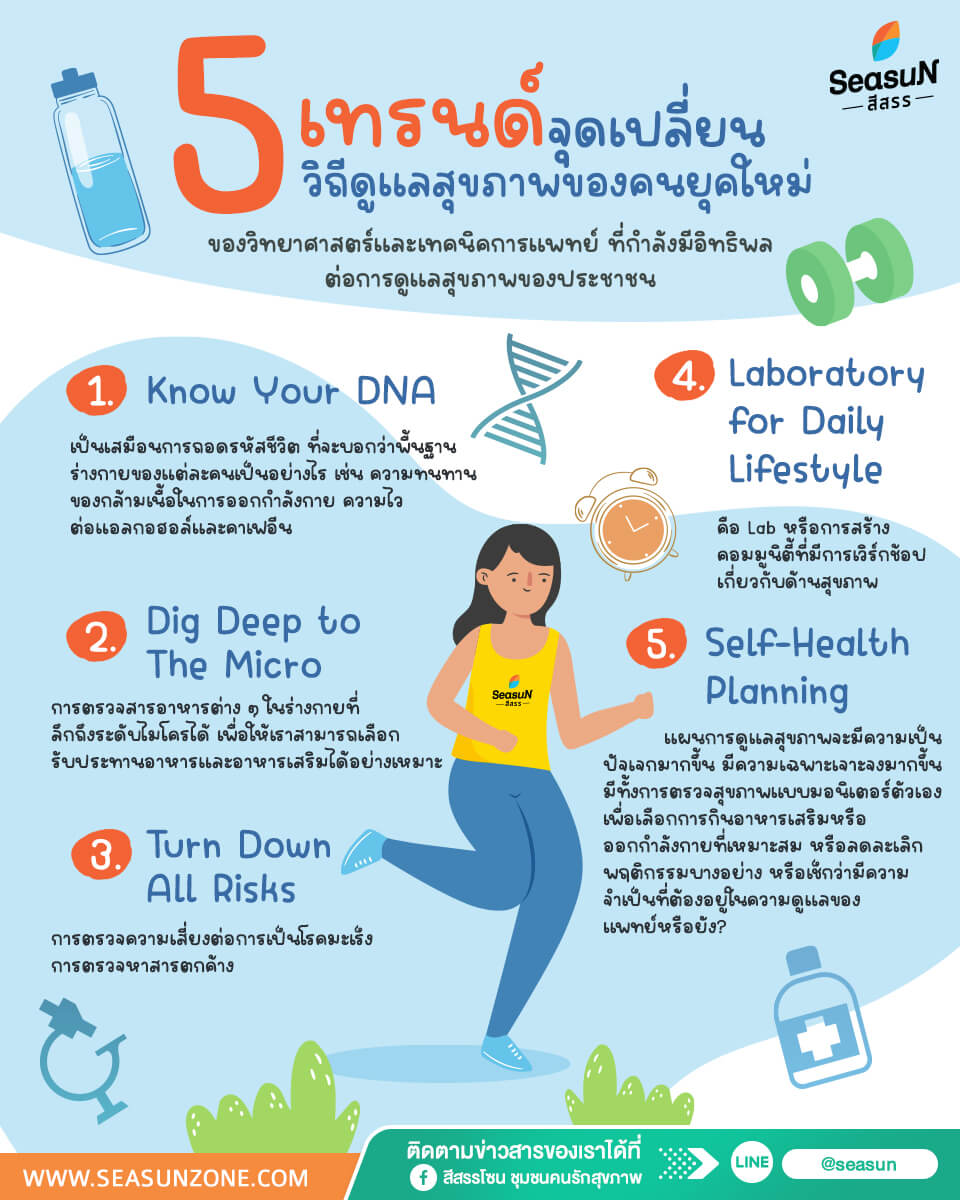 - Self-Health Planning – แผนการดูแลสุขภาพจะมีความเป็นปัจเจกมากขึ้น มีความเฉพาะเจาะจงมากขึ้น มีทั้งการ ตรวจสุขภาพแบบมอนิเตอร์ตัวเอง เพื่อเลือกการกินอาหารเสริมหรือออกกำลังกายที่เหมาะสม หรือลดละเลิก พฤติกรรมบางอย่าง หรือเช็กว่ามีความจำเป็นที่ต้องอยู่ในความดูแลของแพทย์หรือยัง