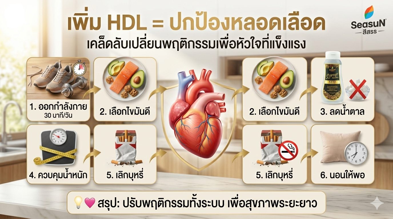 บทสรุป: การเพิ่ม HDL ไม่ใช่เรื่องยากที่ต้องพึ่งพาปาฏิหาริย์ แต่คือการใส่ใจในรายละเอียดเล็กๆ น้อยๆ ของการใช้ชีวิต เมื่อทำอย่างสม่ำเสมอ ผลลัพธ์ที่ได้คือหัวใจที่แข็งแรงและหลอดเลือดที่สะอาดในระยะยาวครับ