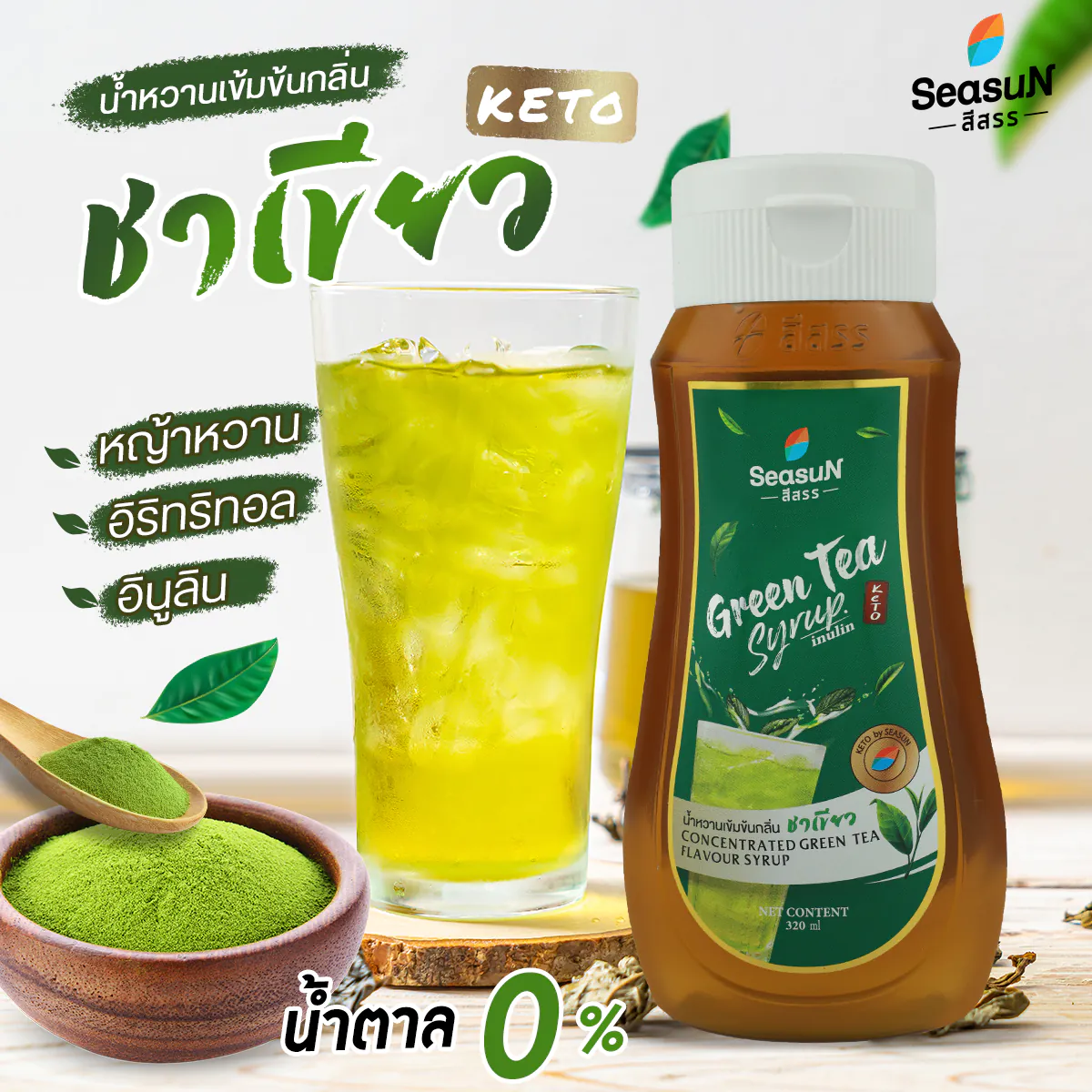 น้ำหวานเข้มข้นกลิ่นชาเขียว สูตรตีโต ตราสีสรร รังสรรขึ้นเพื่อชาวคีโตโดยเฉพาะ คัดสรรวัตถุดิบชั้นดี ทั้งหญ้าหวาน อิริธิธอล และอินูลิน ทั้งสามสารสกัด ไม่ให้พลังงาน แต่ให้ความหวานที่กลมกล่อม ไม่หวานติดลิ้น ใช้ได้กับทั้งอาหารหวาน คาว ร้อน หรือเย็น ก็อร่อย ไม่ทำให้เสียรสชาติอาหาร