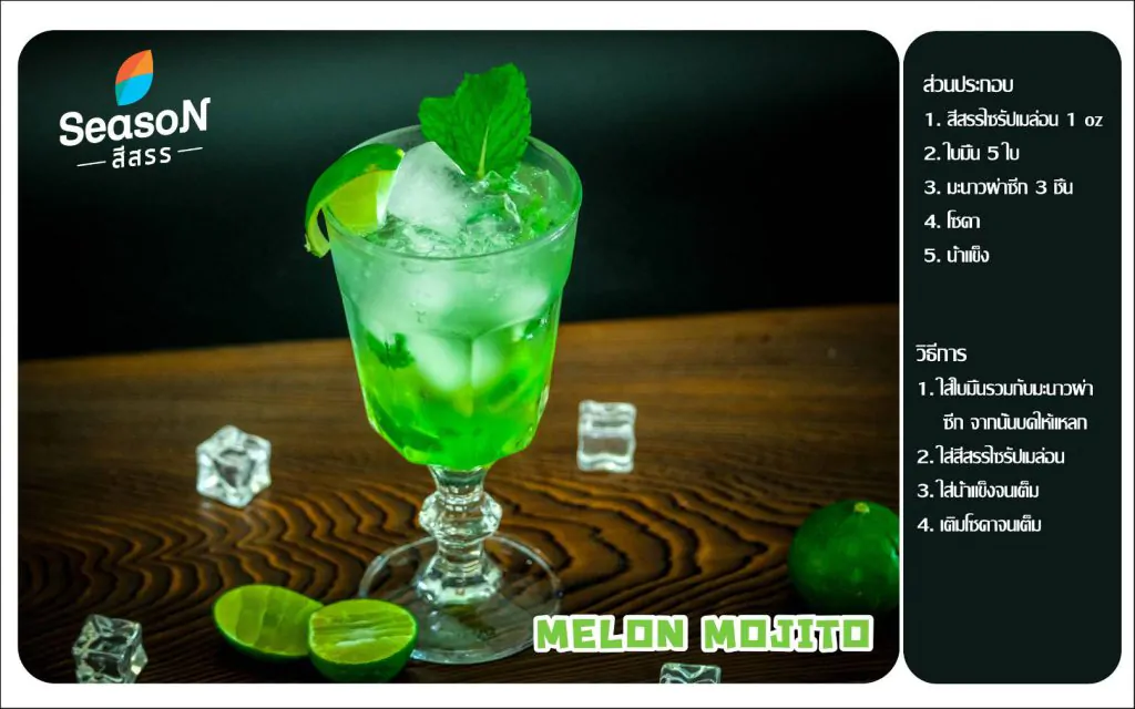 Ingredient Concentrated melon Seasun brand 1 0Z 5 mint leaves 3 pieces lemon halves soda ice How to brew Put the mint leaves together with the lemon wedges. then crushed Add melon-flavored concentrated. Filled with ice Fill the glass with soda. The sweet danger of sugar. Red Butterfly Pea Juice with Fresh Milk by.seasun